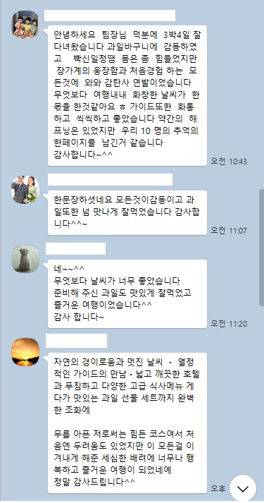 무릎 아픈 저로서는 힘든 코스여서 처음엔 두려움도 있었지만 이 모든걸 이겨내게 해준 세심한 배려에 너무나 행복하고 즐거운 여행이 되었습니다 정말 감사드립니다^^