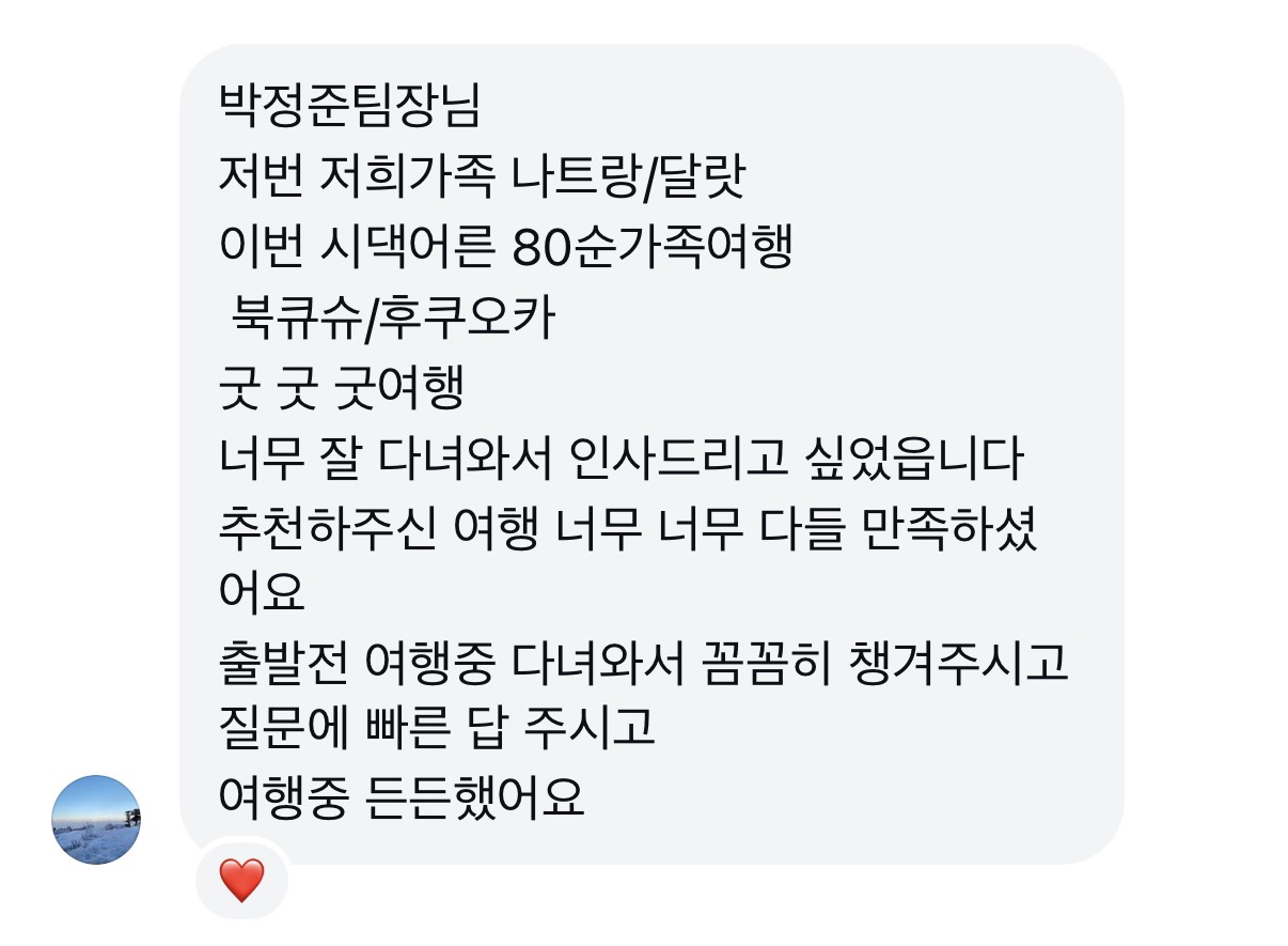 박정준팀장님 저번 저희가족 나트랑/달랏 이번 시댁어른 80순가족여행 북규슈/후쿠오카 굿 굿 굿여행 너무 잘 다녀와서 인사드리고 싶었습니다 추천해주신 여행 너무 너무 다들 만족하셨어요